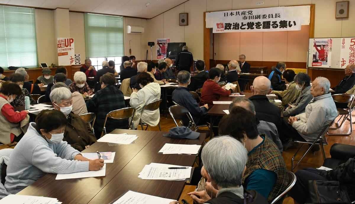 会場から「党外から応援するだけではダメなのか」との質問が寄せられ、市田氏は「戦争か平和か」という歴史的岐路にあるいま「子や孫に無傷で憲法9条を渡せるか、今が頑張り時です。応援席から降りて一緒に綱を引いてほしい」と、入党を呼びかけました。