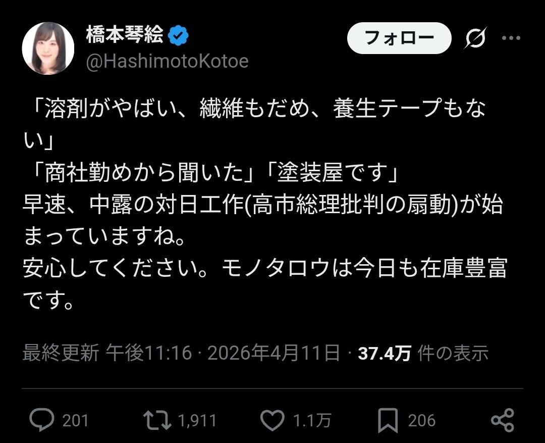 https://x.com/HashimotoKotoe/status/2042970040946037016 - 5 : 2026/04/12(日) 12:16:41.130 ID:rlCZjLlCO