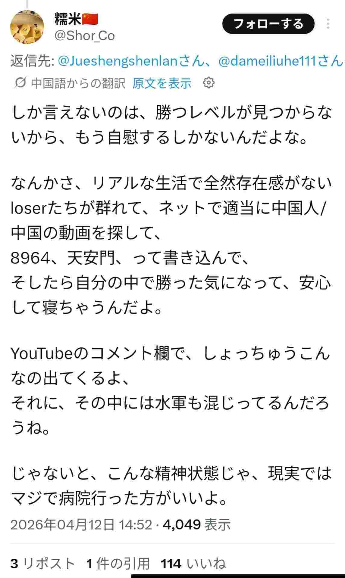 本物の中国人の容赦ない辛辣な書き込みを見た気分を聞いたみたいね - 49 : 2026/04/13(月) 07:41:21.93 ID:oPL6XRAE0