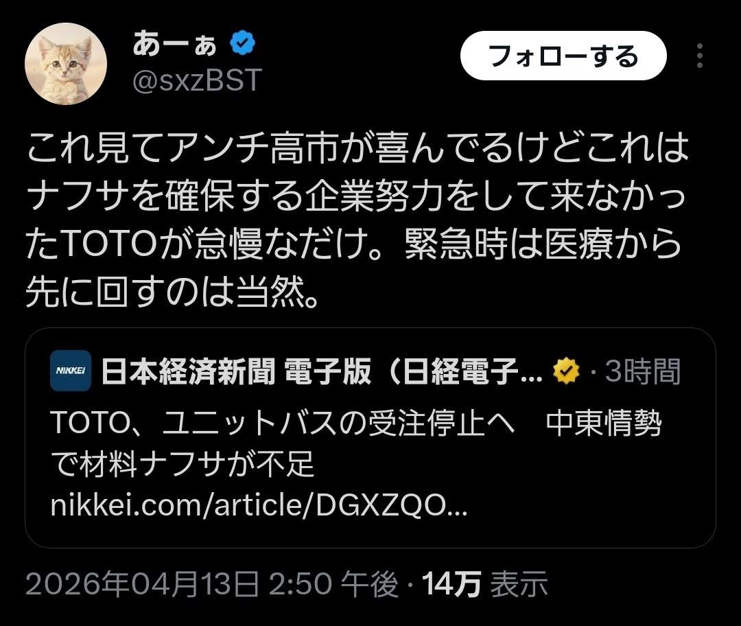 あーぁ (@sxzBST) on Xこれ見てアンチ高市が喜んでるけどこれはナフサを確保する企業努力をして来なかったTOTOが怠慢なだけ。緊急時は医療から先に回すのは当然。x.com - 39 : 2026/04/13(月) 16:40:48.97 ID:T92pAsg30