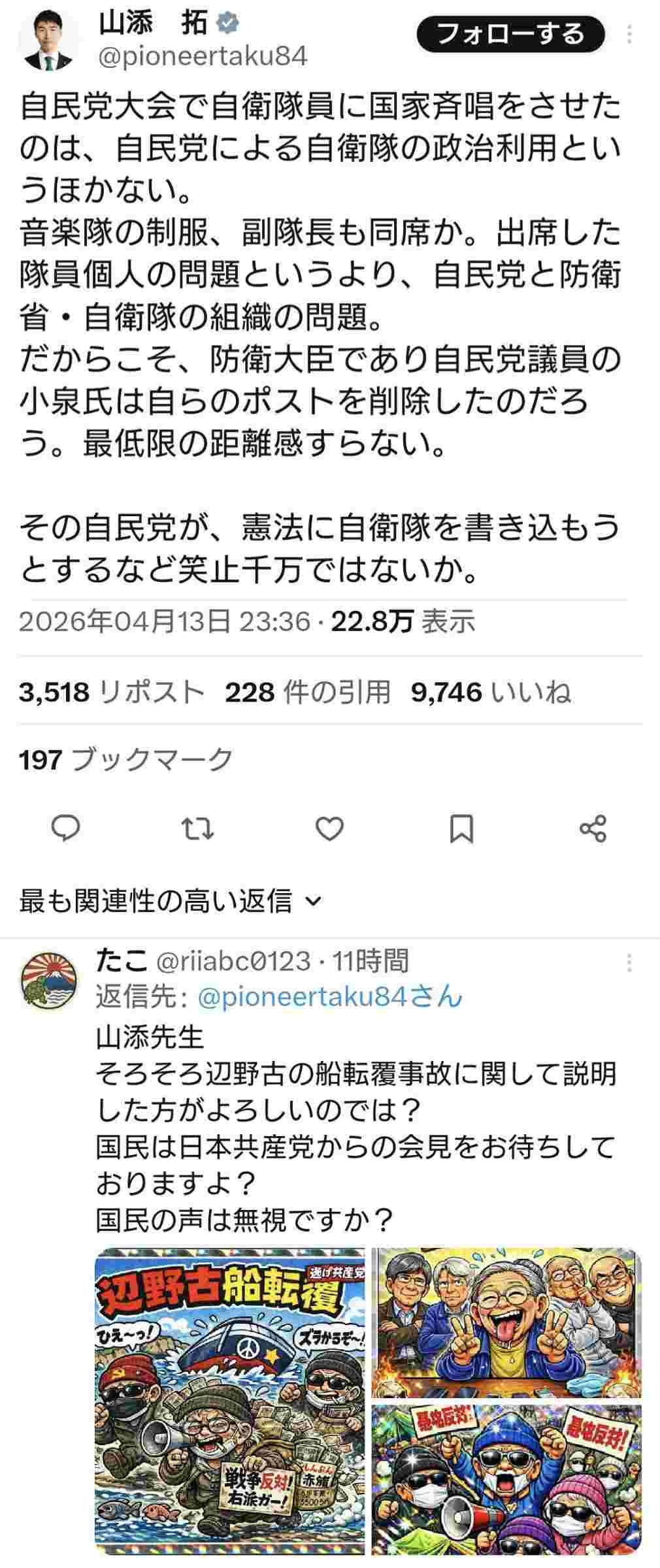 - こういう鬱陶しい事を言い出すからさっさと憲法改正して自衛隊を明記しようぜと言ってるんだよアホが