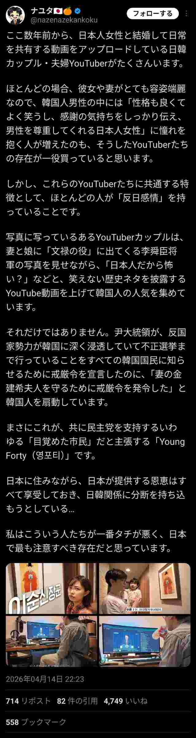 - 【悲報】韓国男性と結婚した日本女性「須らく」反日になってしまう「べき」と炎上