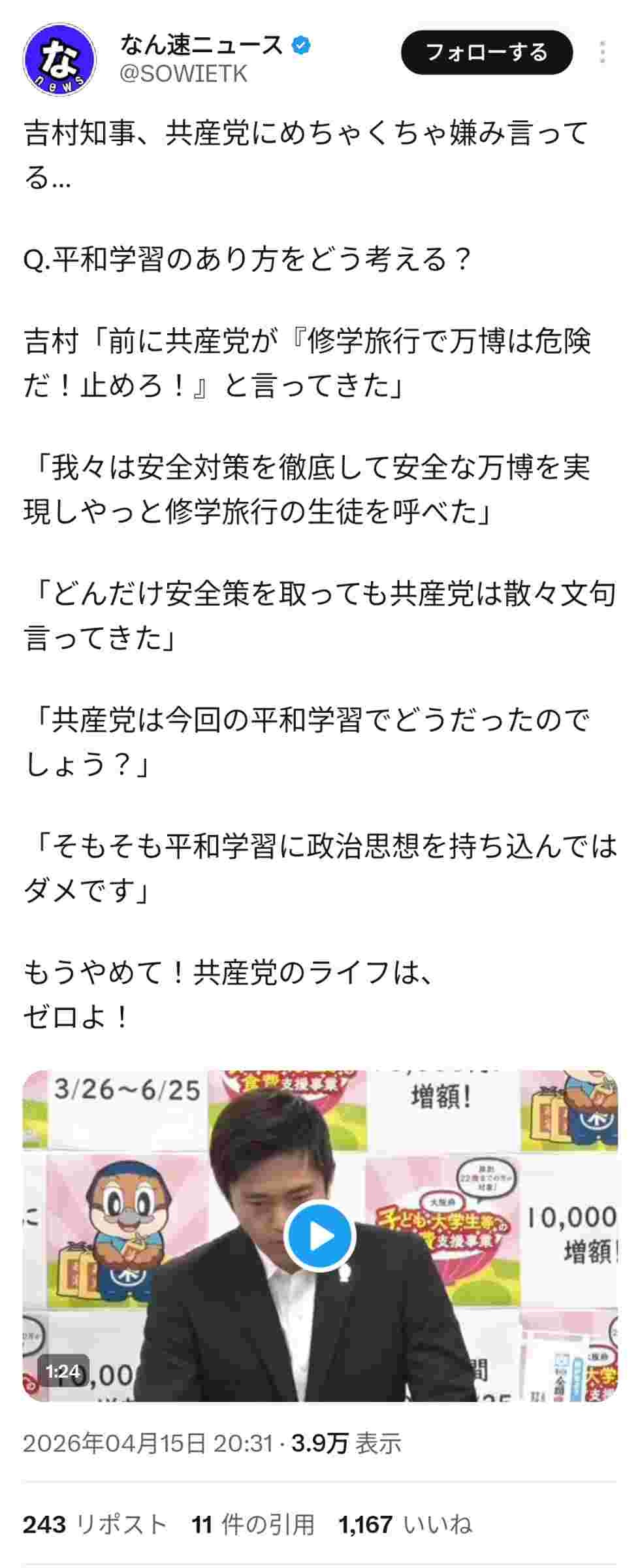 そりゃ1年前の万博で修学旅行誘致したときに散々安全対策で文句言ってたのに高校生をコロシタのは共産党