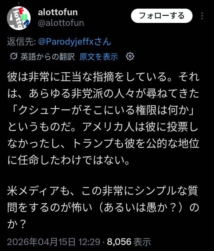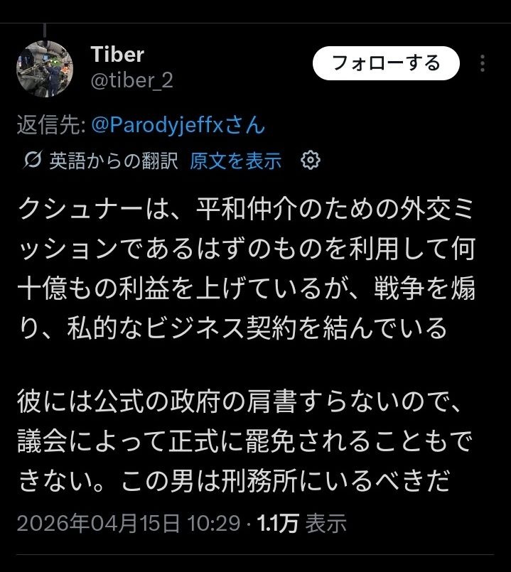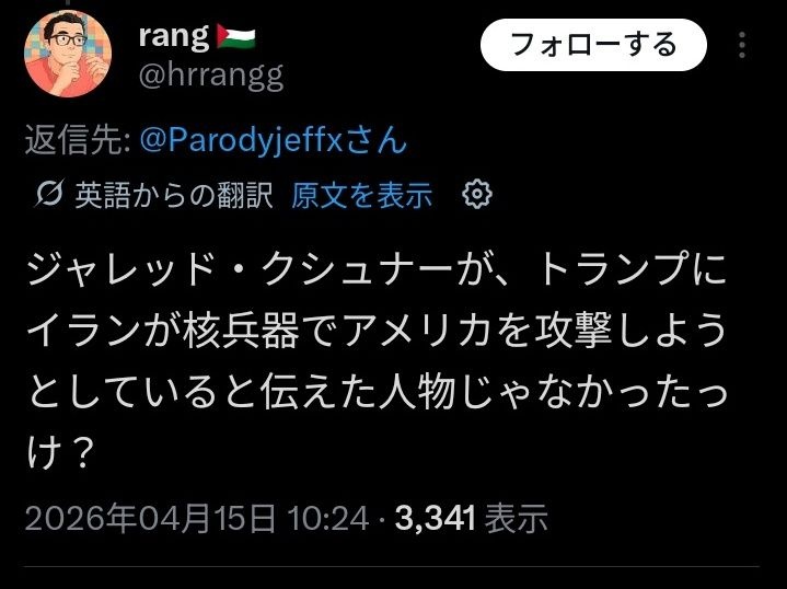 クシュナーはアメリカ生まれアメリカ人ですね - 34 : 2026/04/16(木) 10:26:04.06 ID:p3AUpW6N0