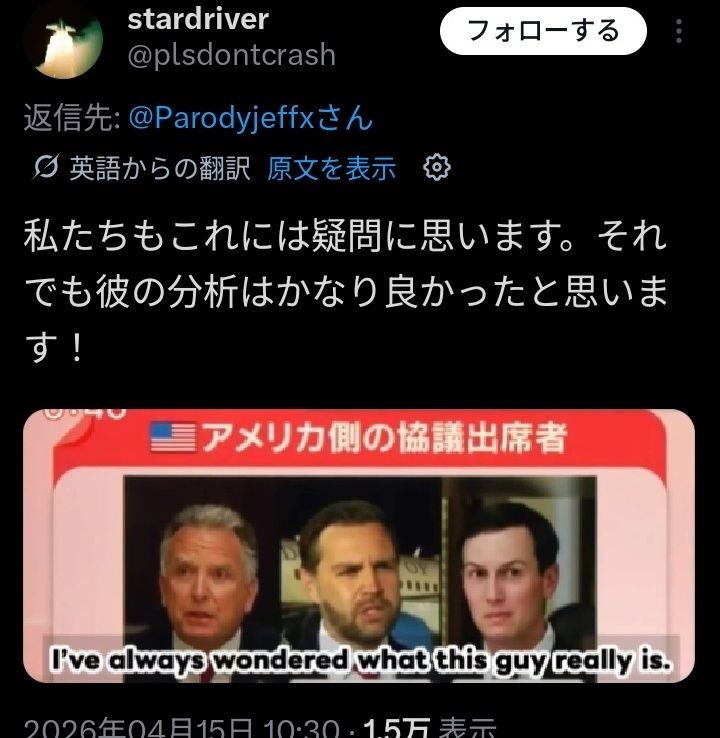 だったらクシュナーを同席させないほうがいいだろ - 33 : 2026/04/16(木) 10:25:06.39 ID:Tog/i9/u0