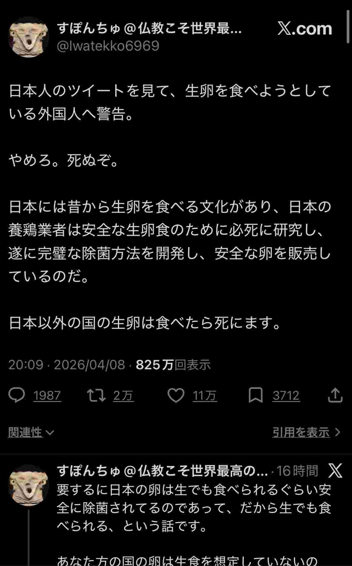 日本人のツイートを見て、生卵を食べようとしている外国人へ警告。
