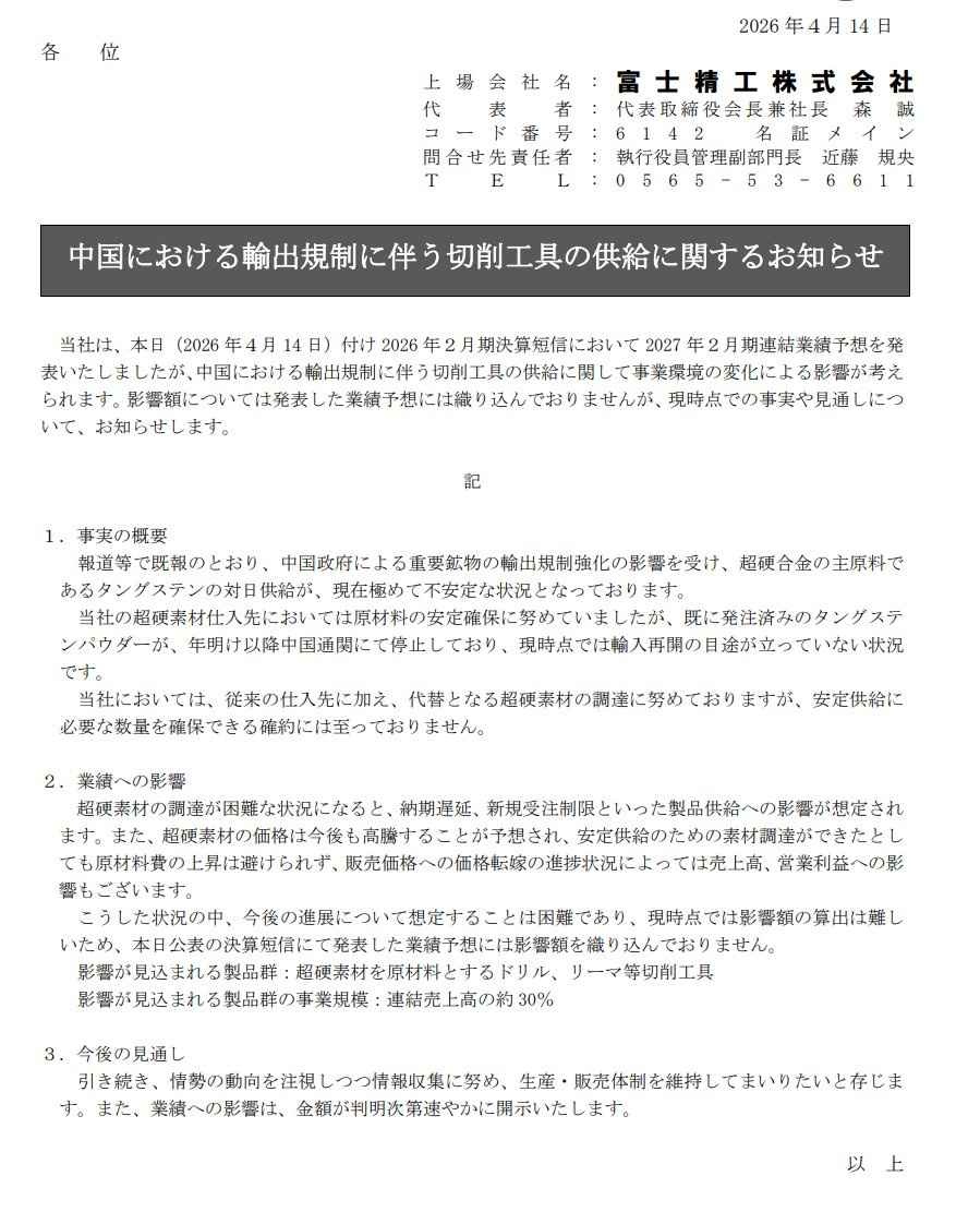 ちなワイの取引先もタングステンないから超硬の製造停止した - 10 : 2026/04/17(金) 12:13:33.777 ID:HCXdeFZcW