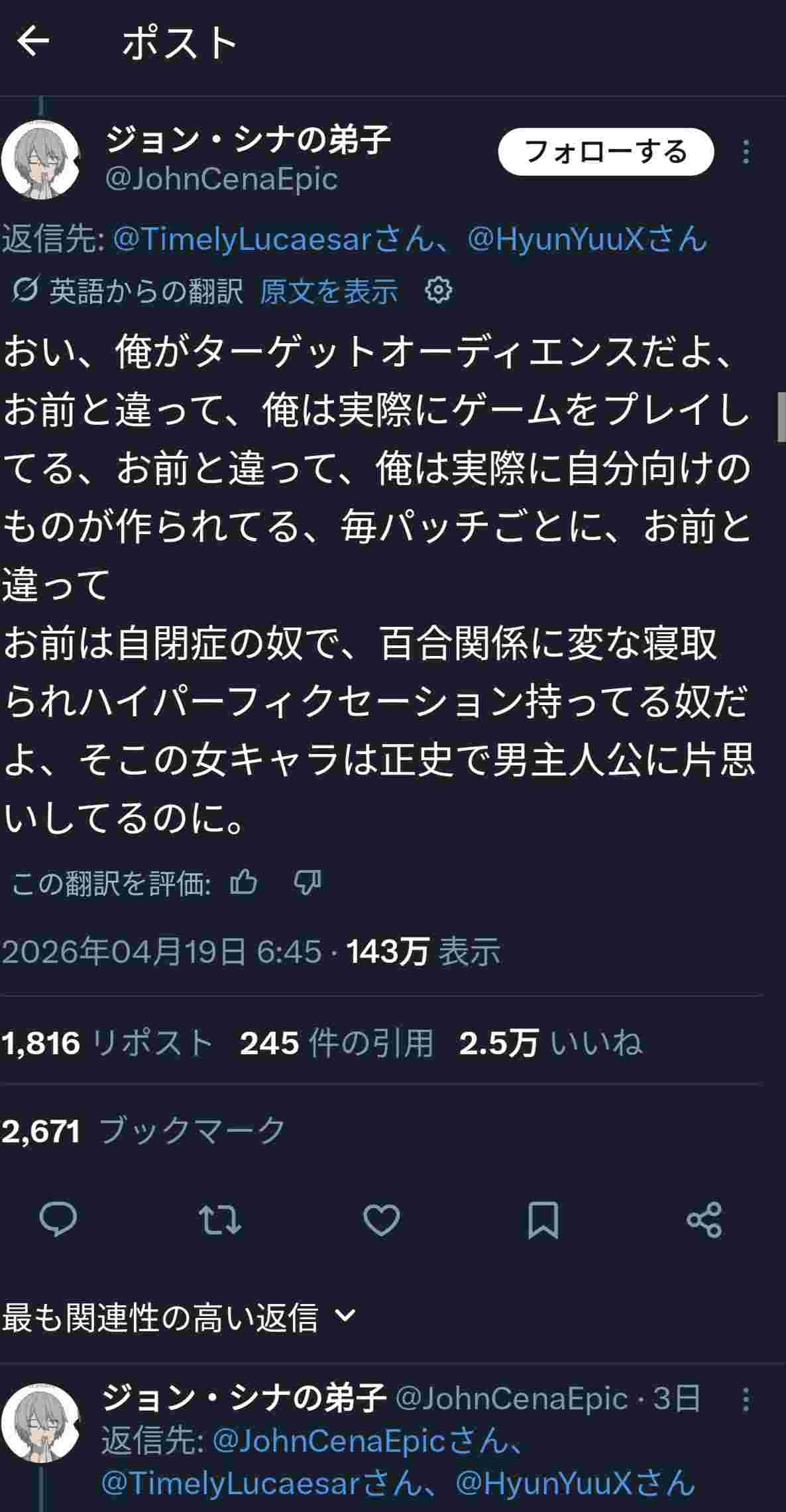 既に百合好きが来ないようにゲートキーパーされとるし - 16 : 2026/04/23(木) 08:34:17.572 ID:edXiEgBP9