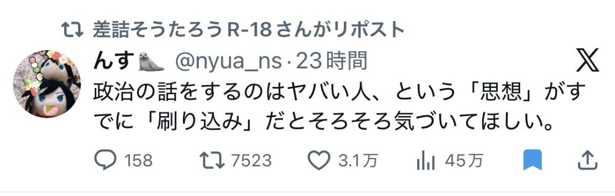 - まさに今の日本って政治の話するとすぐにやばい人ってレッテル貼りされるよな