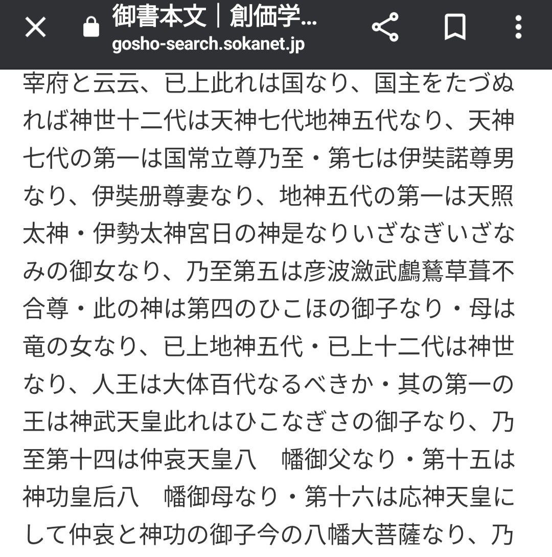 乃至第五は彦波瀲武鸕鶿草葺不合尊・此の神は第四のひこほの御子なり・母は竜の女なり、已上地神五代・已上十二代は神世なり、人王は大体百代なるべきか・