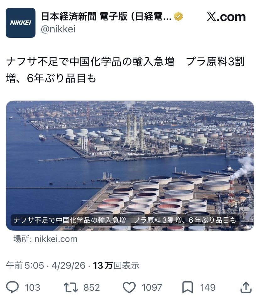- ガチでナフサ不足煽る反日スパイ企業潰してくれてありがとう