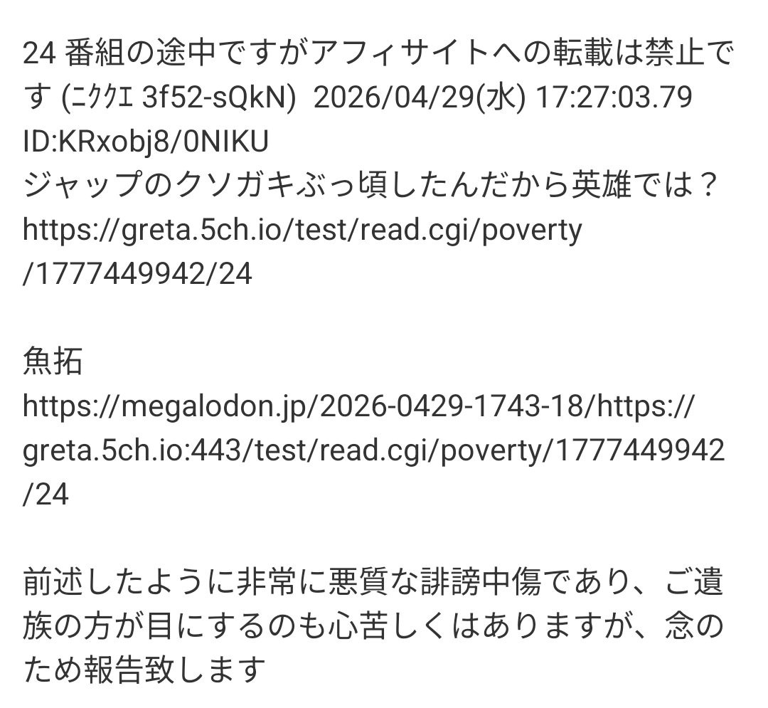 誹謗中傷に対するものも - 27 : 2026/04/29(水) 18:13:23.68 ID:rRonexa30NIKU