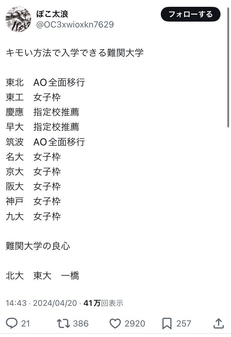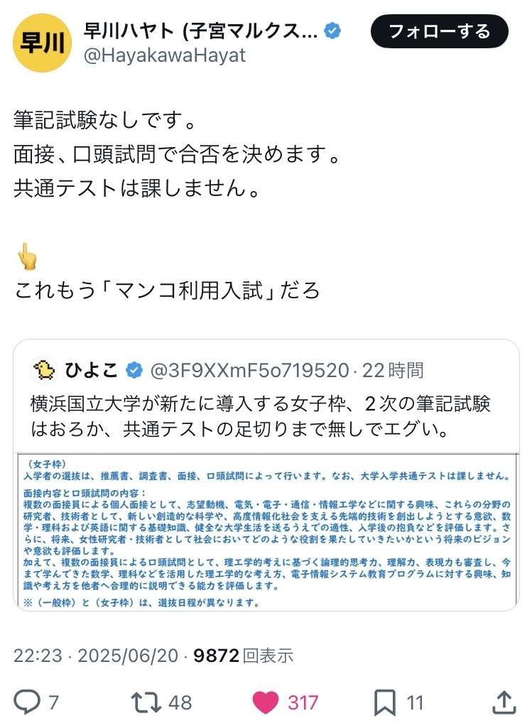 その上で、女性入学者全体の半分以上が女子枠合格者で完全にバカを入れる為のシステムになっていて終わり過ぎてる。 - 12 : 2025/07/05(土) 04:42:19.77 ID:npe1PTQo0