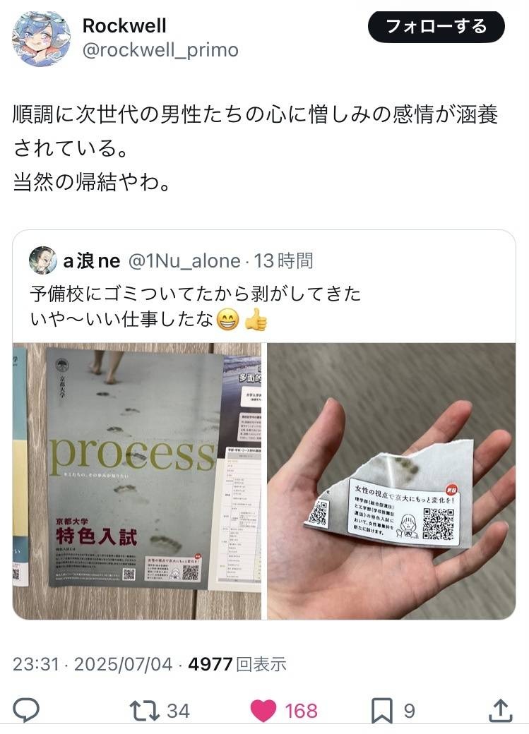 特別扱い(女専用ゆるゆる入試)で一流大学に入学していく様を目の当たりにするわけやから特に今の若い男の子は幼少期から「男女平等」を徹底的に教育で叩き込まれてきてるから