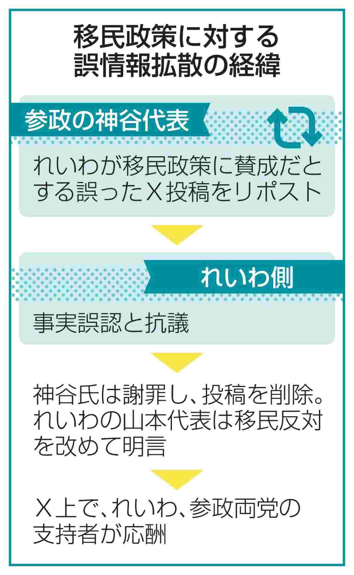 れいわ新選組が移民政策に賛成しているかのような誤った情報がX(旧ツイッター)上で拡散している。れいわは参院選公約で移民政策に反対を明記している。拡散は参政党の神谷宗幣代表が第三者の誤った投稿をリポスト(転載)したのが原因だった。