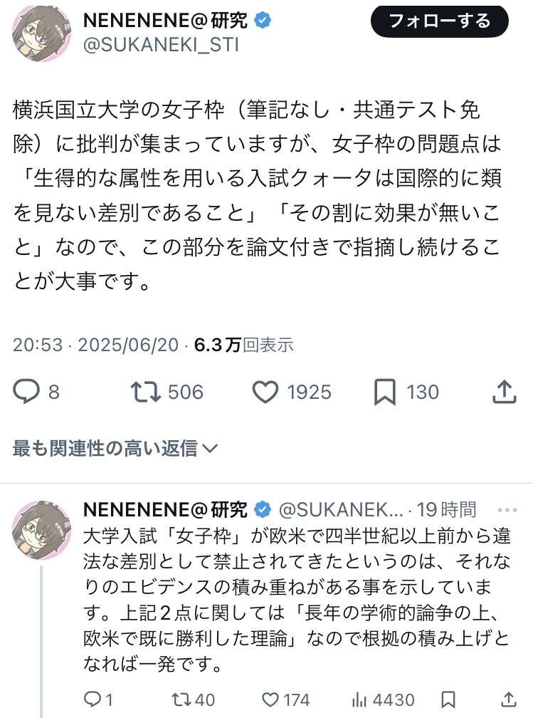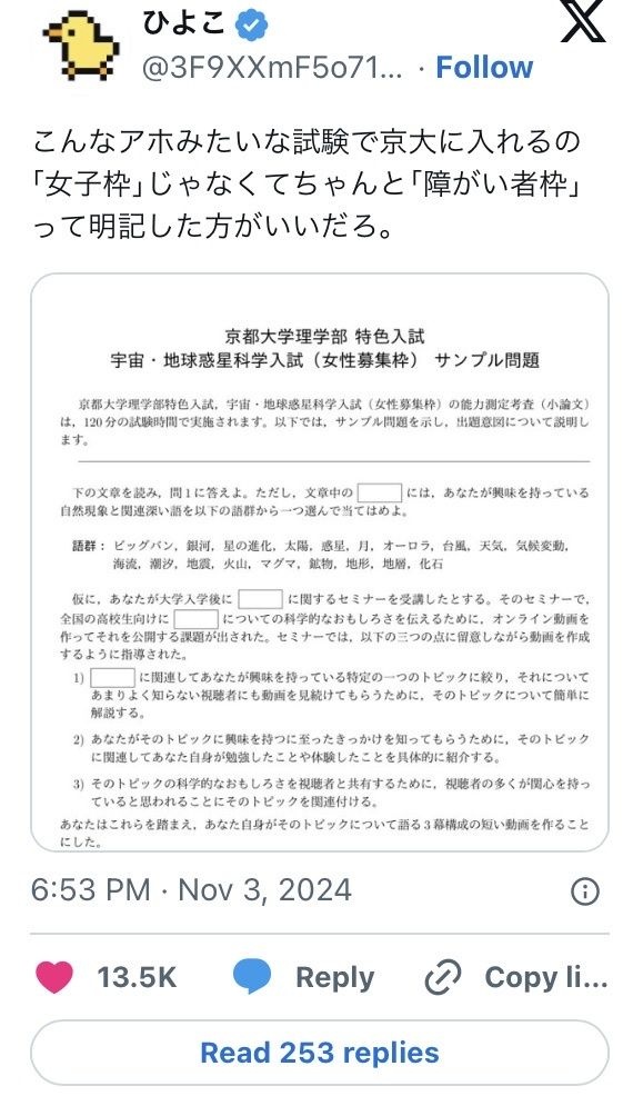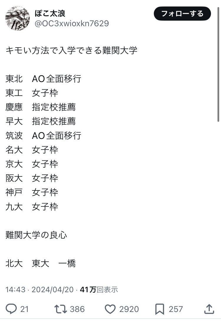 その上で、女性入学者全体の半分以上が女子枠合格者で完全にバカを入れる為のシステムになっていて終わり過ぎてる。 - 14 : 2025/07/05(土) 21:35:03.61 ID:gMT0g33o0