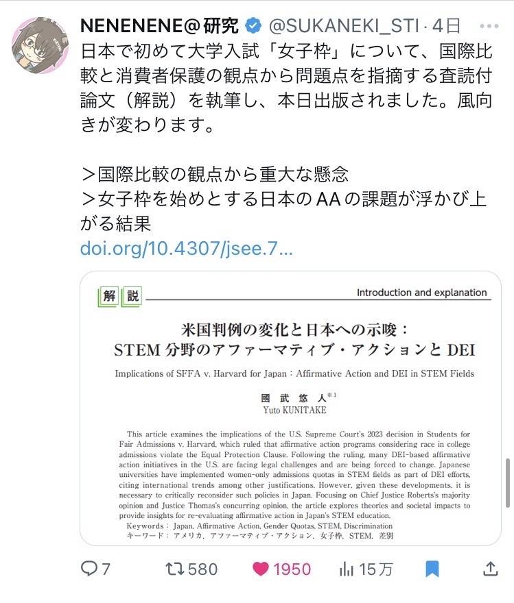 - 女子枠の差別性・違法性を指摘する査読付き論文も出版された模様