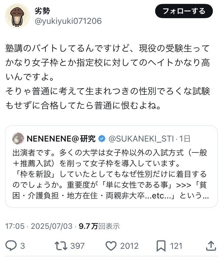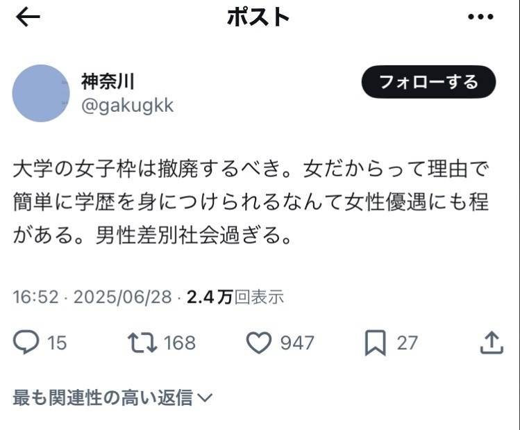 自分より学力の低い女が「女」というだけで憧れの大学にゆるゆる入試で入らせてもらえて、自分より良い学歴を手に入れていくわけやから