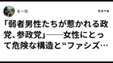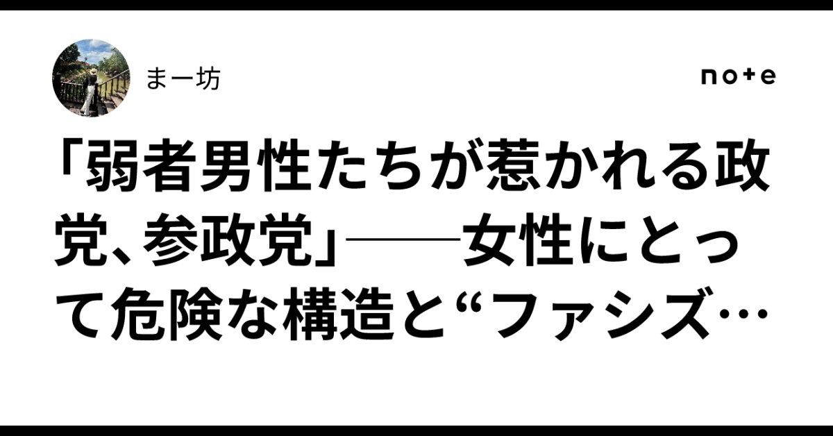 「弱者男性たちが惹かれる政党、参政党」──女性にとって危険な構造と“ファシズムの気配”|まー坊はじめに SNSで参政党の街頭演説や拡散動画を見るたび、私はある種の居心地の悪さと恐怖を感じていた。 家族、伝統、道徳、教育、母性──。 一見すると“優しい言葉”のように思えるその言説の中に、 私は女性としての自由を脅かされる気配を感じずにはいられなかった。 ⸻ 「女は家庭に」──やさしい言葉で覆われた支配欲 参政党は...note.com - 2 : 2025/07/07(月) 19:30:02.77 ID:gZsF0AEsd0707