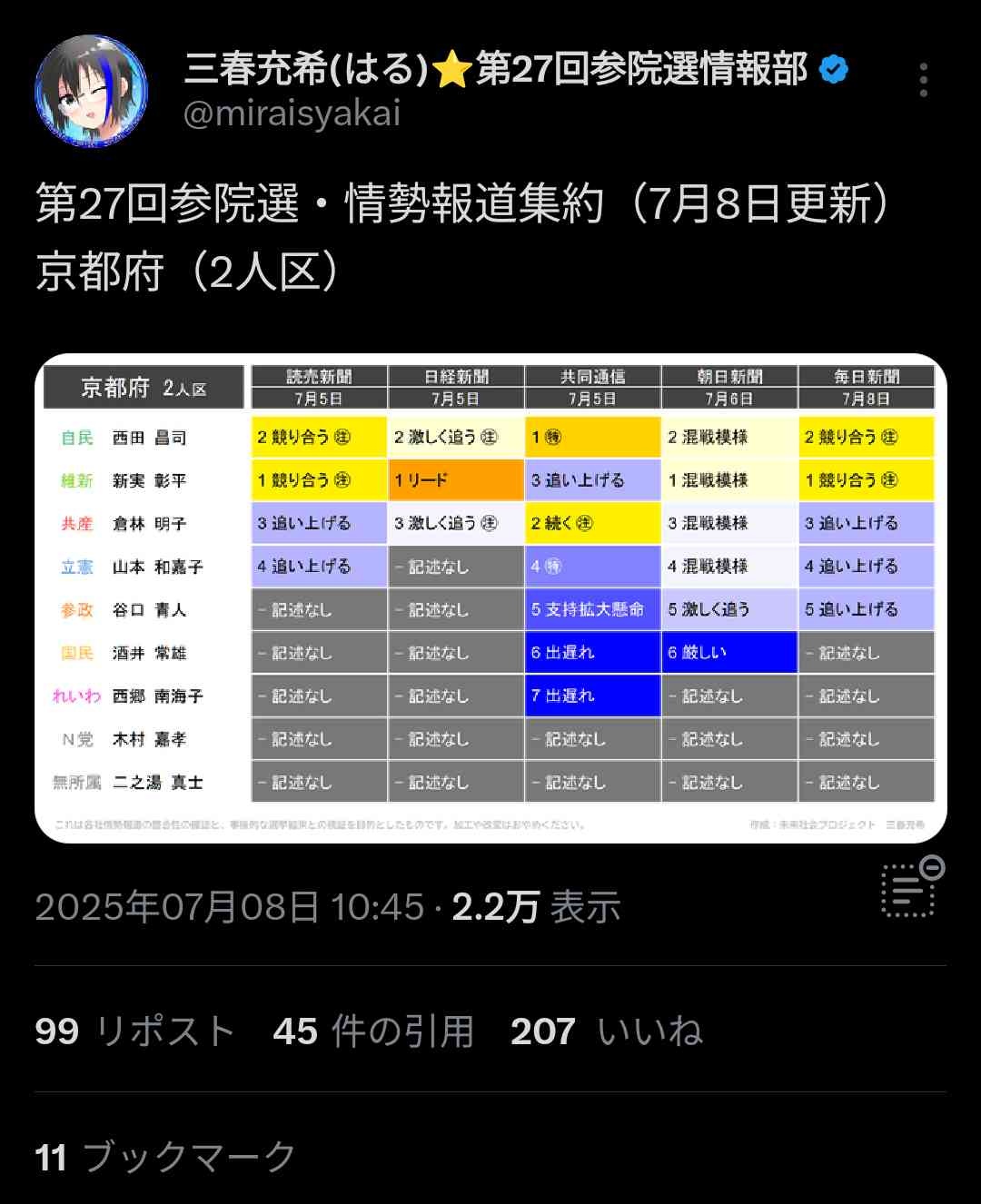 京都は昔から共産が強く、他の野党とは組まない 知事選も市長選も自民公明維新立憲国民vs共産になるれいわの西郷南海子さんは元々共産党に近い人だったが、除名騒動や共産党の88歳のジジイにSNSストーキングされたりしてれいわから出馬