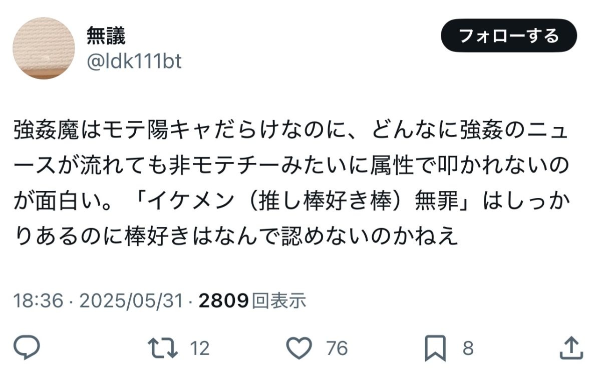 - ホントこれなぁ。弱者男性はそういう行動が起こせないから安心安全な童貞なのに、なぜか叩かれる。