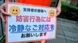 それでも、アンチは約30メートル後方の一角から集団で罵声を浴びせているが、スタッフらが「妨害行為に冷静な対応をお願いします」と書かれたビラを示したためか、罵声に反応する支援者は確認されない。