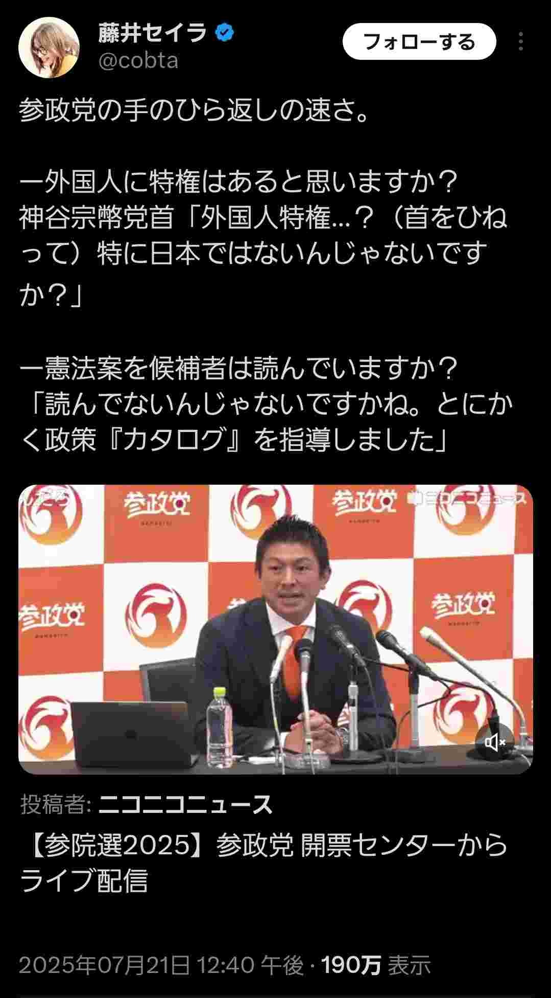 藤井セイラ (@cobta) on X参政党の手のひら返しの速さ。 ー外国人に特権はあると思いますか? 神谷宗幣党首「外国人特権…?(首をひねって)特に日本ではないんじゃないですか?」 ー憲法案を候補者は読んでいますか? 「読んでないんじゃないですかね。とにかく政策『カタログ』を指導しました」x.comhttp://a.coma.com - 2 : 2025/07/21(月) 18:20:39.47 ID:1Aa0Jqjc0