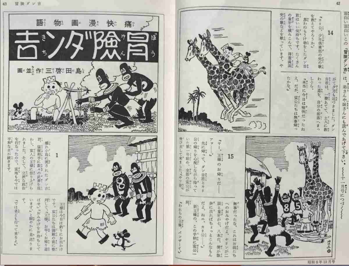 何もない未開の島において、樹木や動物たちといった自然の素材をユニークな発想をもって生かし、粛々と文明社会を打ち立てていく物語は、海外領土の開拓に邁進していた時代背景とマッチした。そのため、同誌において既に国民的な人気を博していた田河水泡の「のらくろ」と、その人気を二分するまでになるには、それほどの時間を要さなかった日本人の少年・ダン吉はネズミのカリ公と釣り舟に乗って眠っているうちに流されてしまい、はるか南の島に漂着した。そこで出会った蛮公(島の先住民)に捕らえられるが、カリ公の機転もあって逆に蛮公たちから王として尊敬される存在となる。ダン吉は彼らとともに、知恵を絞った文明を築いていく。