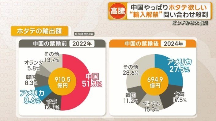 「外国でもホタテは人気で、特に中国とかで人気なので。そういう需要もあり、値段自体はすごく高くなっています」それまではホタテ輸出額の半分を中国が占めていましたが、中国向けがゼロになった去年はアメリカが27%、ベトナムなど東南アジアへの輸出も増え分散化が進みました。