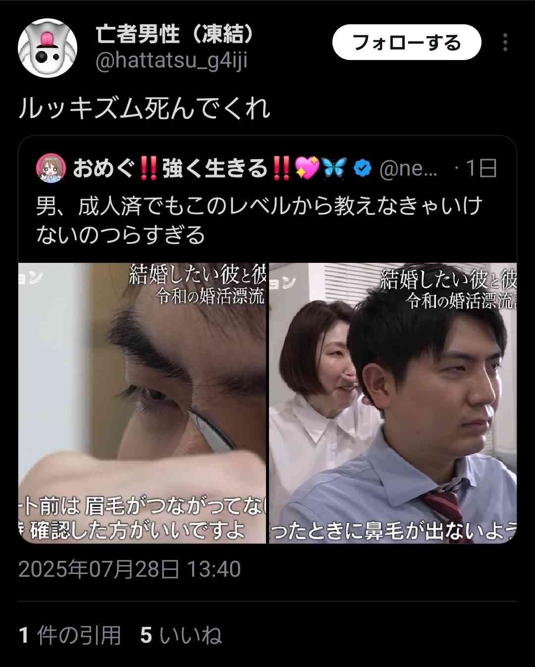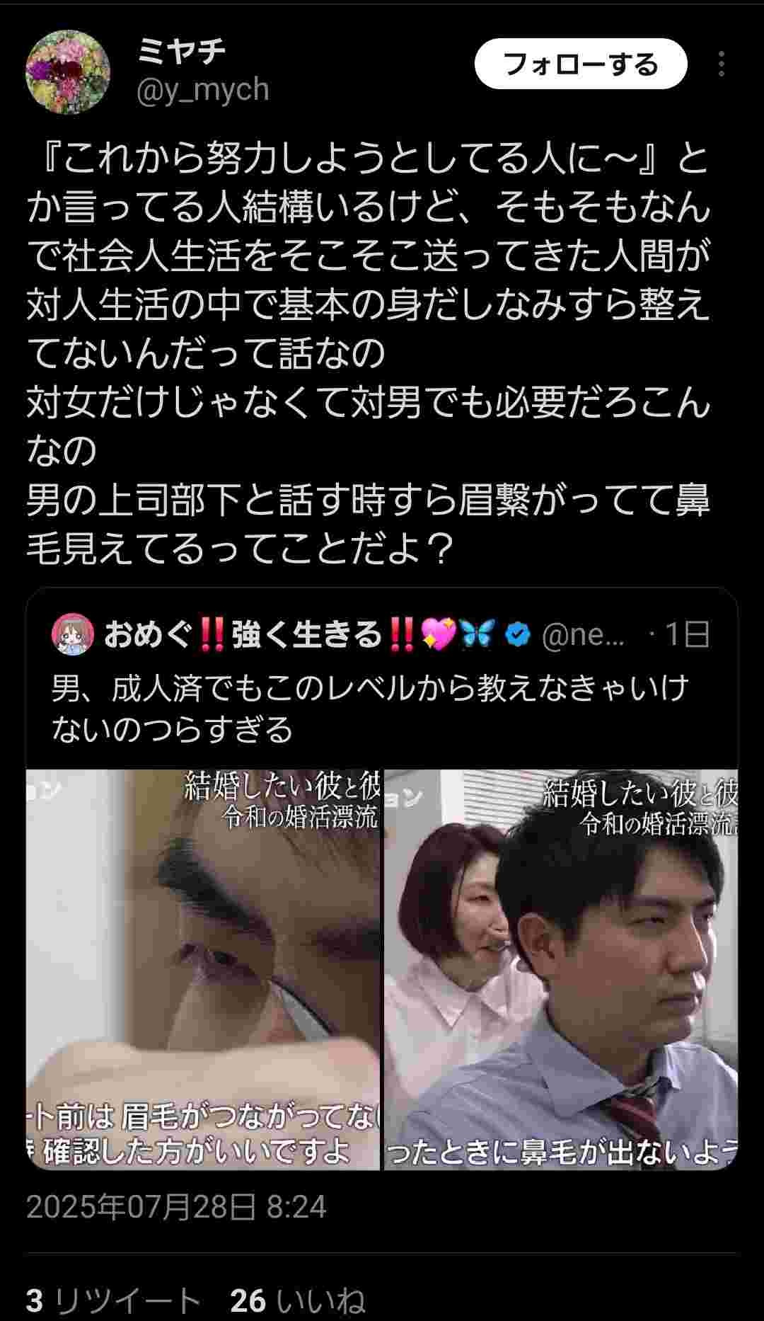 鼻毛出して婚活しにいってどうにかなると思うのか?w - 15 : 2025/07/28(月) 20:48:29.44 ID:YmIkW2CA0