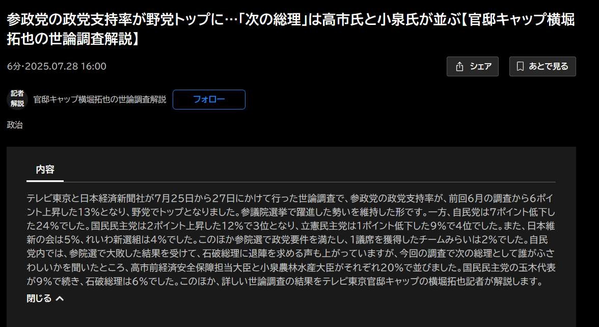 テレ東:参政党の政党支持率が野党トップに…「次の総理」は高市氏と小泉氏が並ぶ【官邸キャップ横堀拓也の世論調査解説】