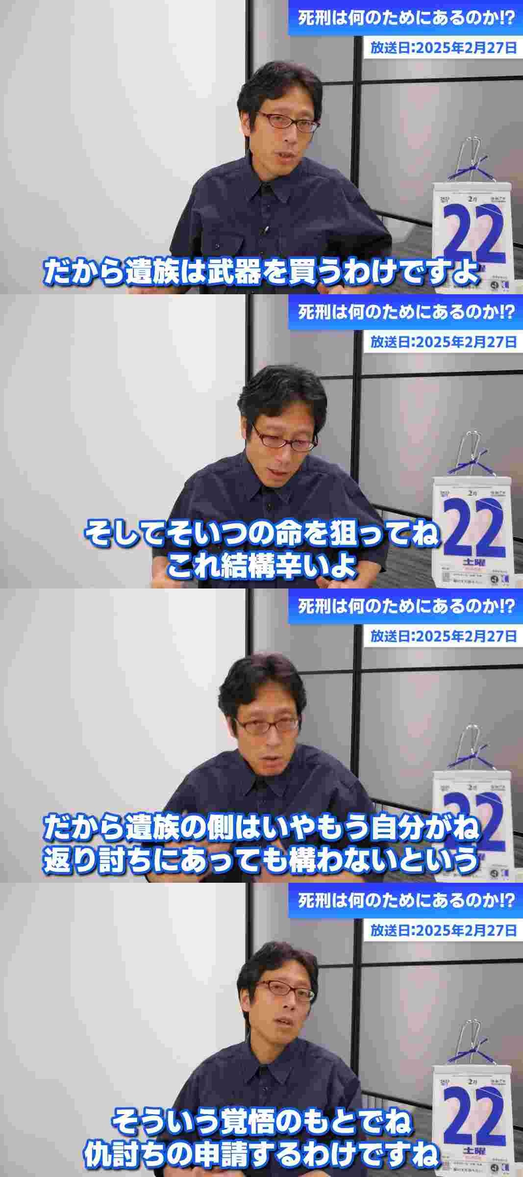 - 仇討ちとかが横行しないように国家が死刑を代行してるんじゃないですかね