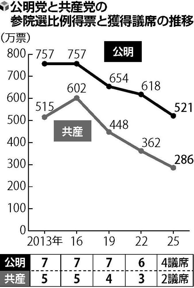 老舗政党である公明党と共産党が苦境に立たされている。参院選ではいずれも得票が伸びず、惨敗した。