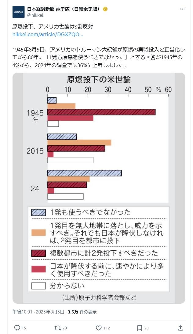逆に今も6割超は原爆を落として本当によかったと思っとるんやで - 9 : 2025/08/05(火) 23:00:14.74 ID:6Q3NwkHd0