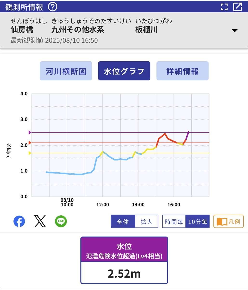 08月10日 17時37分福岡県によりますと、10日午後5時ごろ、宗像市を流れる山田川の長縄手橋観測所と、八並川の田熊観測所で氾濫の危険性が非常に高い氾濫危険水位を超えました。