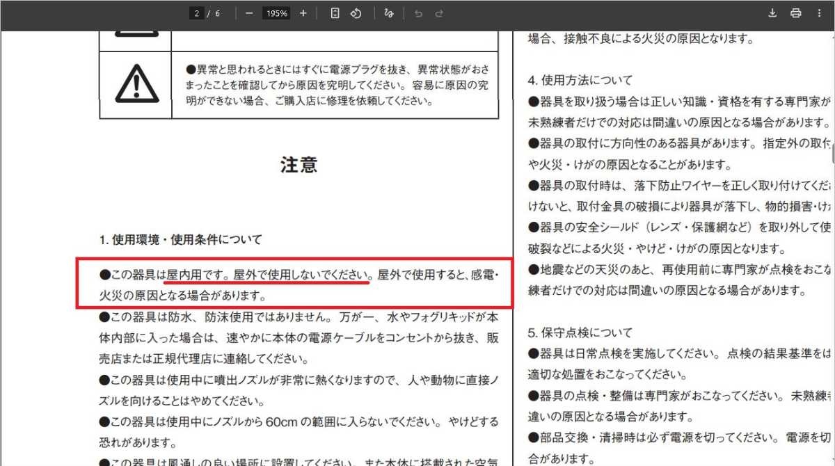 - そもそも説明書には「屋外で使用するな」「ヤケドするから人に向けて使うな」と書いてある