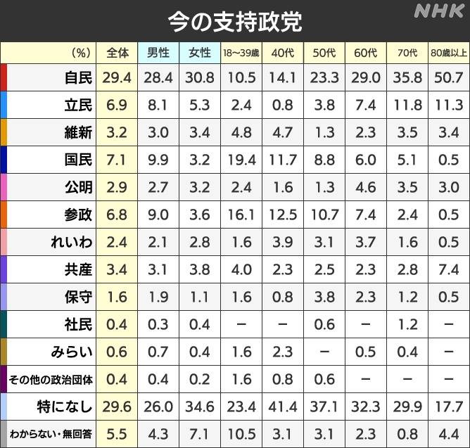 政党支持率 自民29.4% 国民7.1% 立民6.9% 参政6.8% | NHK【NHK】8月の各党の支持率です。「自民党」が29.4%、「立憲民主党」が6.9%、「日本維新の会」が3.2%、「国民民主党」が7…www3.nhk.or.jp - 2 : 2025/08/13(水) 10:15:03.07 ID:FjfhXyiL0