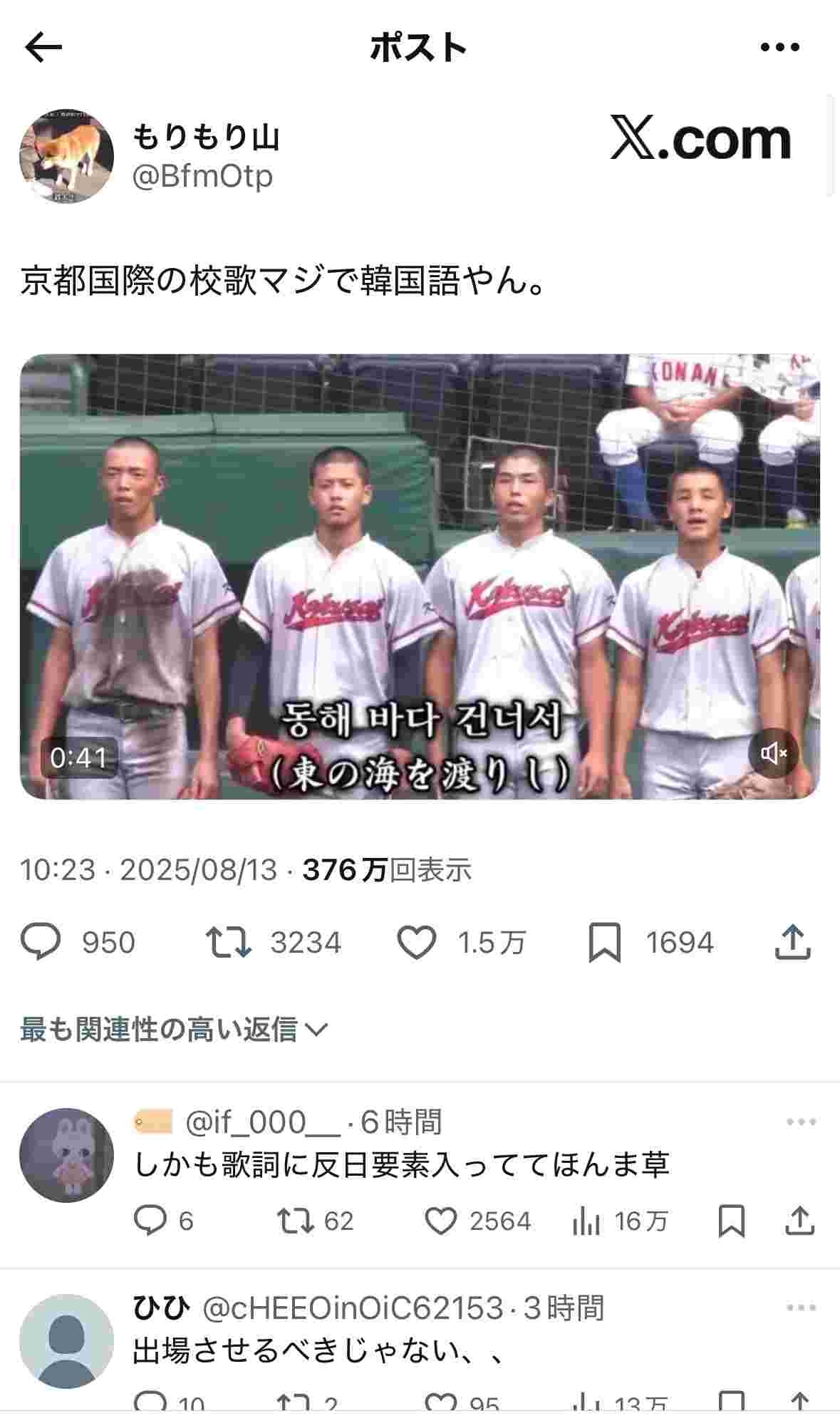 - 韓国校歌の学校に負けてる生徒じゃなくて勝った生徒が愛国批判されてるの可哀想じゃね?なんなら野球部のメンバーも日本人多いやろ多分
