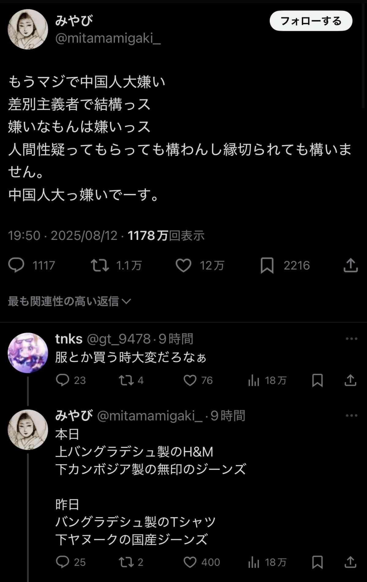 - 中国人目の前にしたらヘラヘラしてる癖にSNSではこれ
