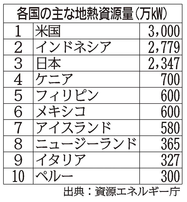 日本は地熱資源量が2347万キロワットで、世界最大規模の地熱地帯を持つ米国、火山島が多いインドネシアに次ぐ世界3位だ。東北や九州地方に地熱発電所が集積している。一方で、地熱発電設備容量では同10位にとどまる。米国やインドネシア、フィリピンとの差は大きい。豊富な地熱資源を生かし切れていない。