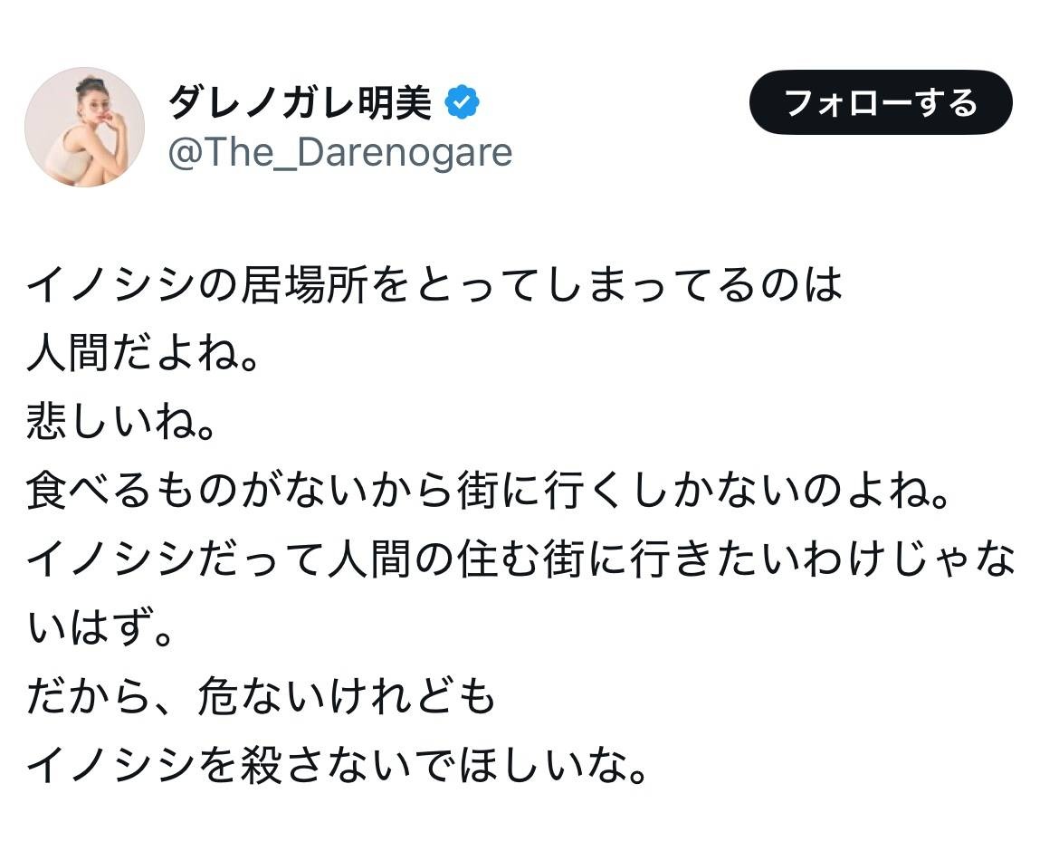 - もしダレノガレ明美の親族全員イノシシに殺されても同じこと言えるんかな