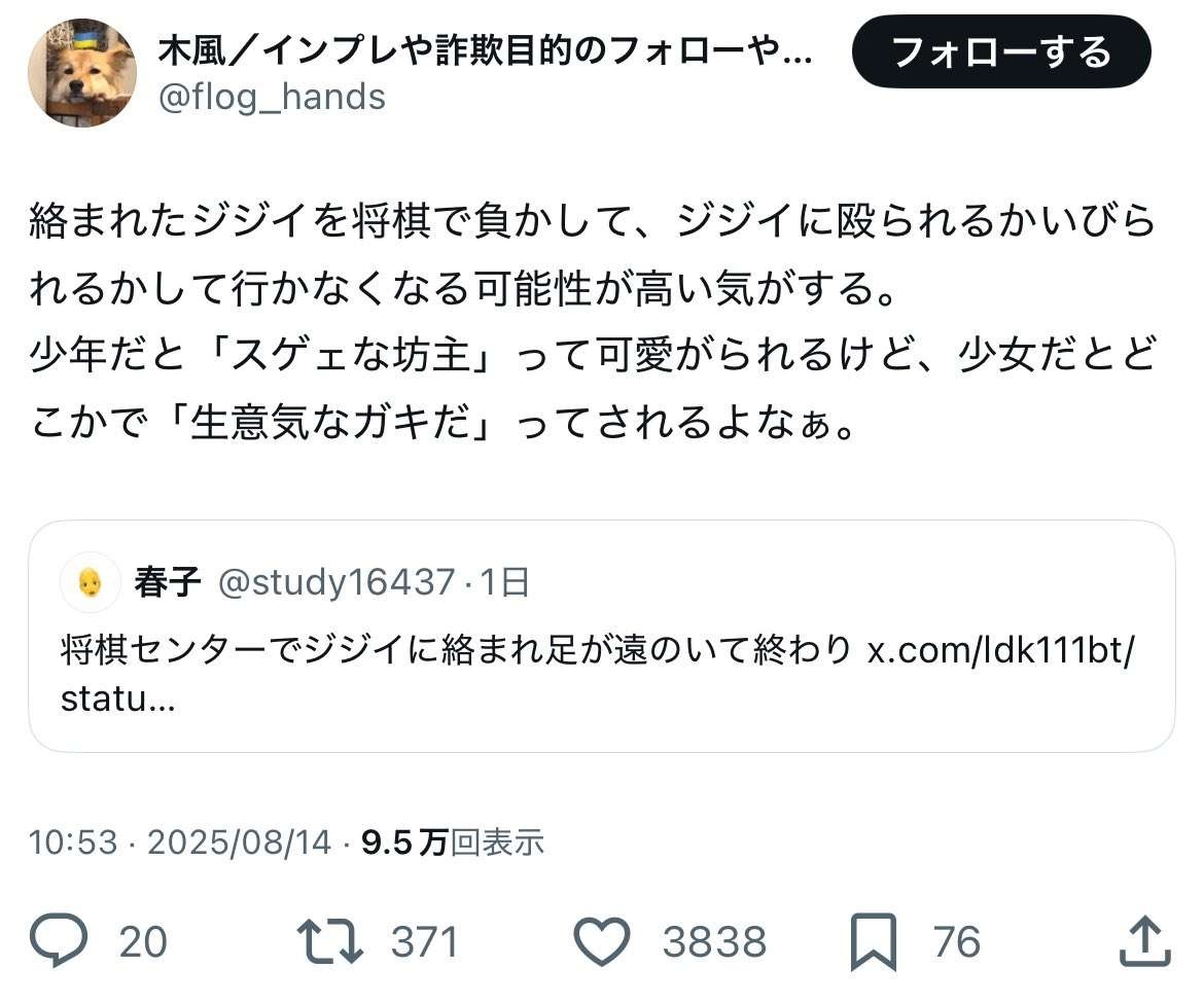 - それ女は棋士として男に全く足元にも及ばないって認めてることになるけどフェミはそれでええんか?