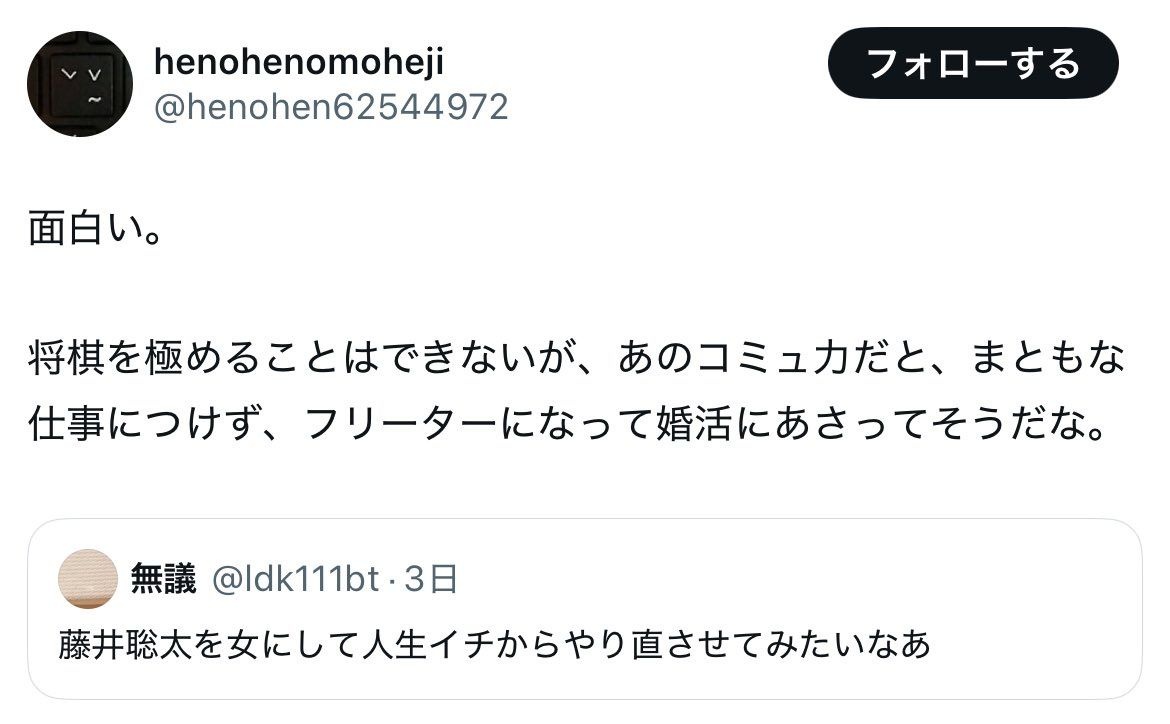 - 藤井聡太が女に生まれてたらとかいうその無意味な仮定なんか意味あんの
