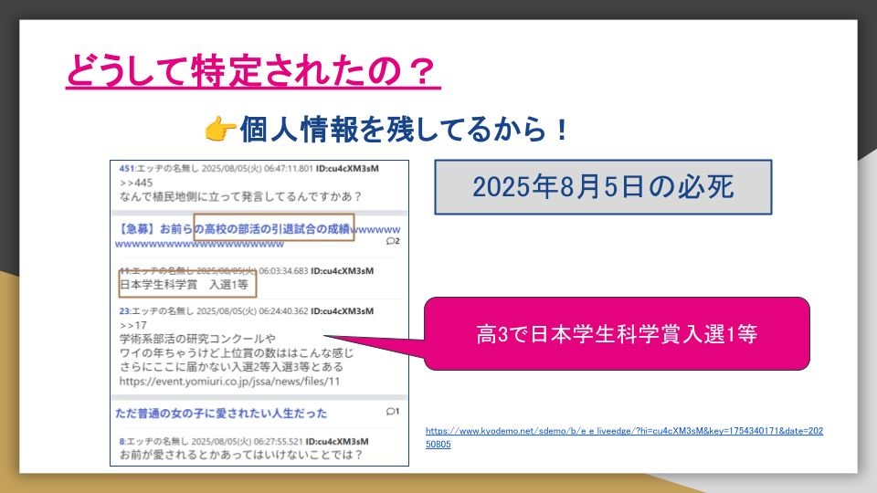 文体目立ってたし前から鬱陶しいと思ってたが日本学生科学賞の情報出したのを見てガチで特定行けると思って必死集めたで - 47 : 2025/08/18(月) 06:07:13.012 ID:EscHyVUKE