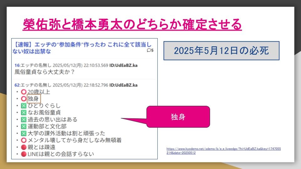 - 最後にどっちかを確定させる作業やがこいつは自分は独身やと言っとる