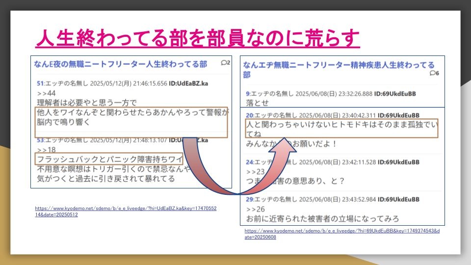 - こうやって匿名掲示板で攻撃的なのは自分がそうやって攻撃される側の人間なんやろな