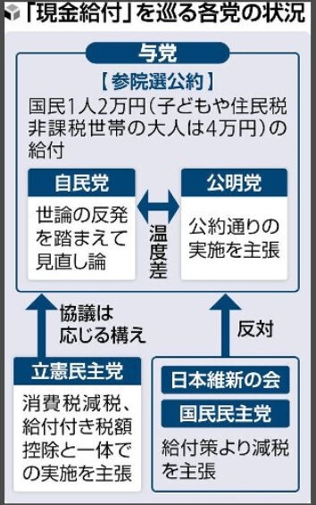 立憲民主党は、参院選公約に国民1人2万円の給付を明記したが、消費税減税や「給付付き税額控除」と一体での実施を要求している。立民幹部は「与党が本気でないのに、助け舟を出すことはない。困るのは与党だ」と冷ややかだ。