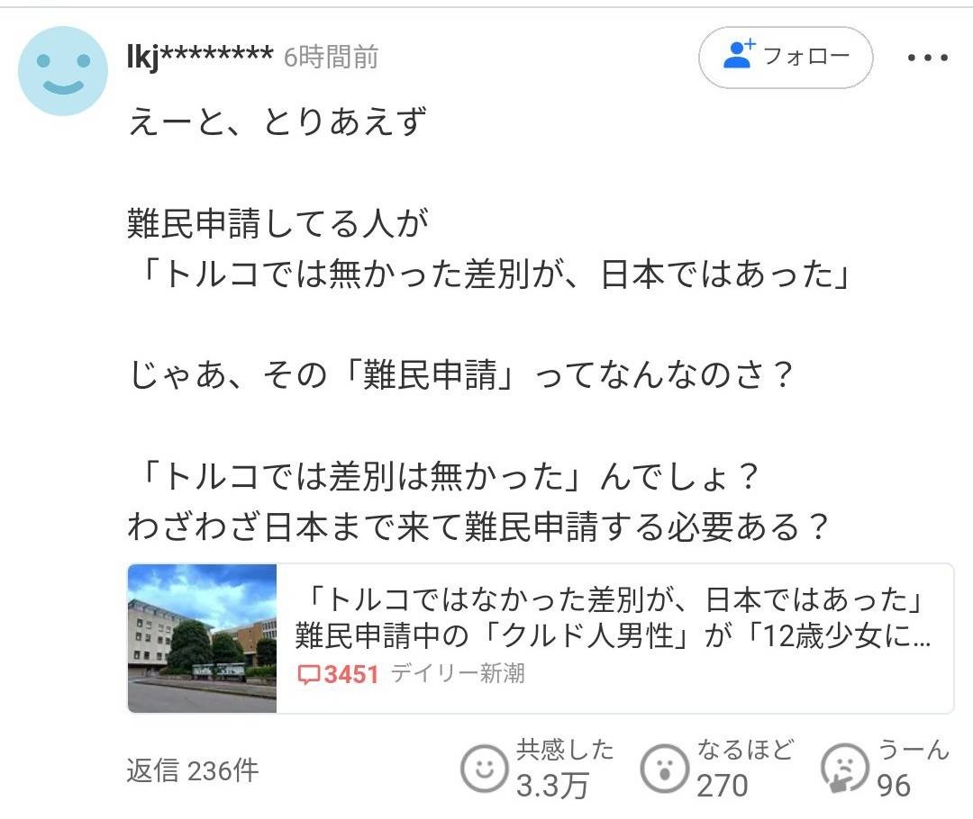 - トルコ政府「日本政府はちゃんとクルド人を追い出せ。奴らはトルコで迫害なんかされていない、難民ではない!」
