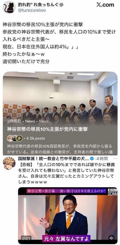 - 神谷宗幣の移民10%主張が党内に衝撃