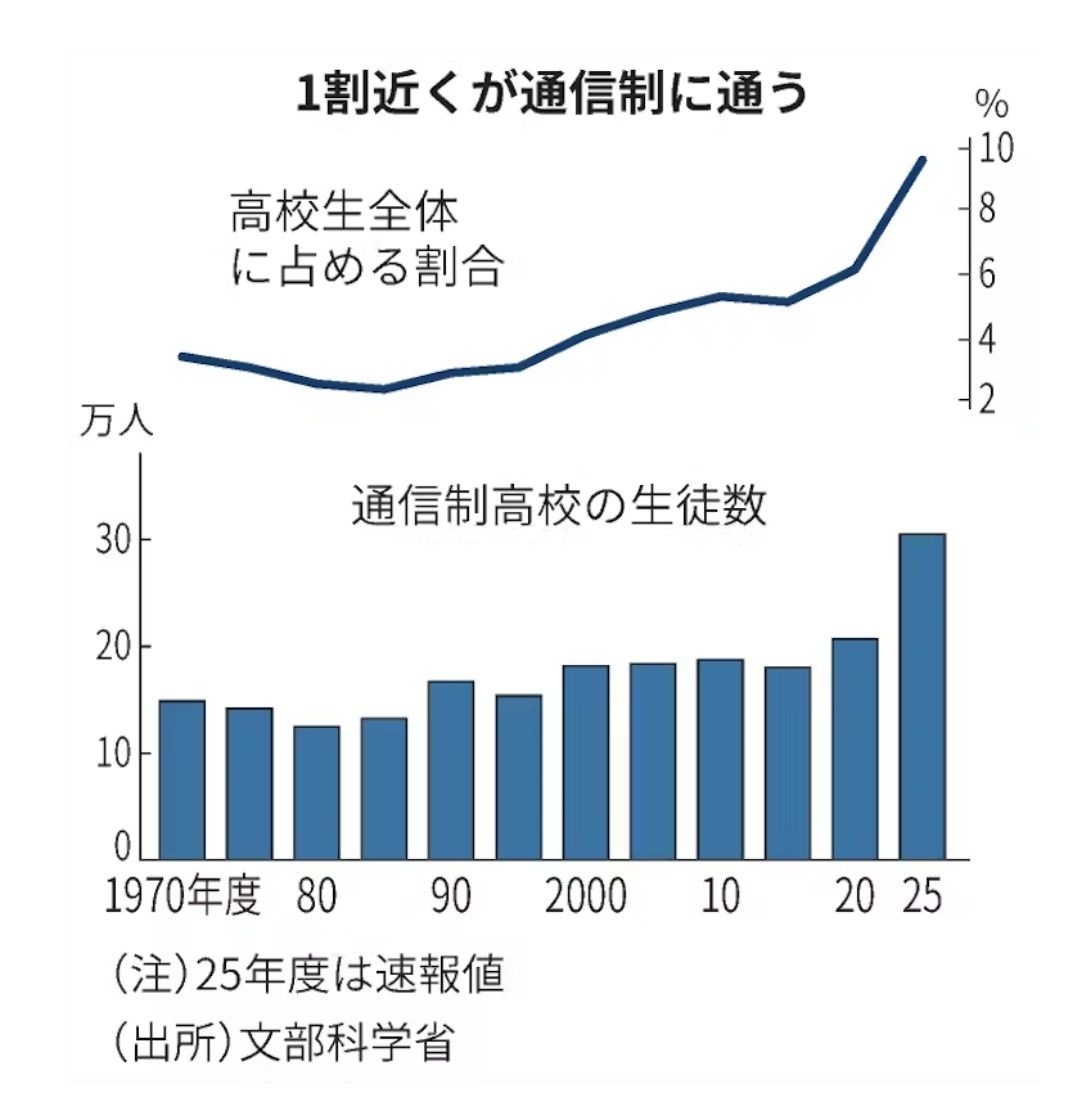 通信制高校に通う生徒が2025年度に初めて30万人を超え、過去最多を更新したことが文部科学省の調査で分かった。不登校の広がりなどが背景にある。学校の新設が相次ぐなか、不適切な運営が指摘された事例もあり、学びの質の担保が課題となっている。 - 2 : 2025/08/31(日) 11:21:46.62 ID:7NuUQ6ZI0